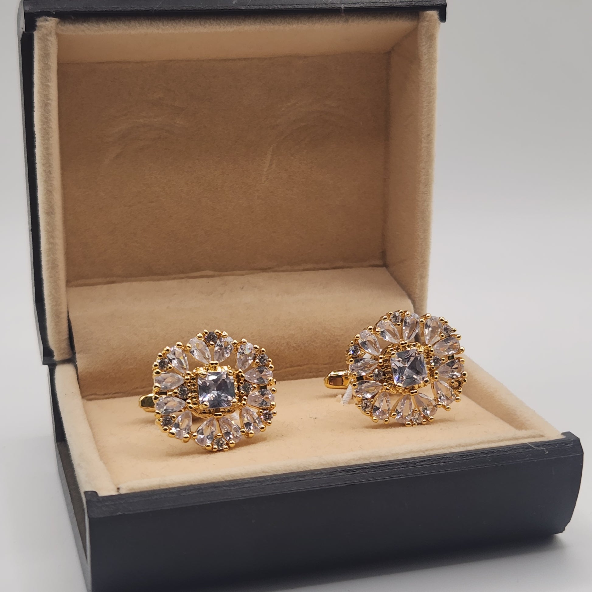 Make a statement. These eye-catching cufflinks feature brilliant clear stones set in a unique, sunburst pattern on a rich gold-tone finish. Instantly adds a touch of sophistication to any shirt.
